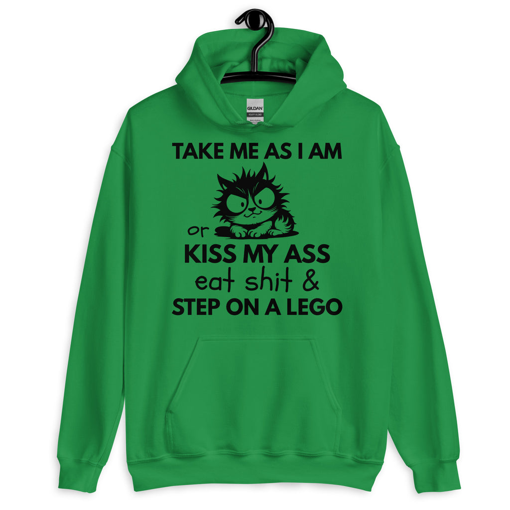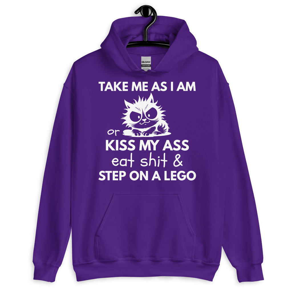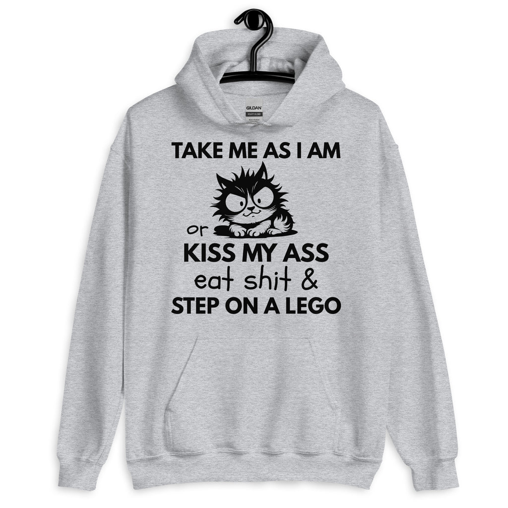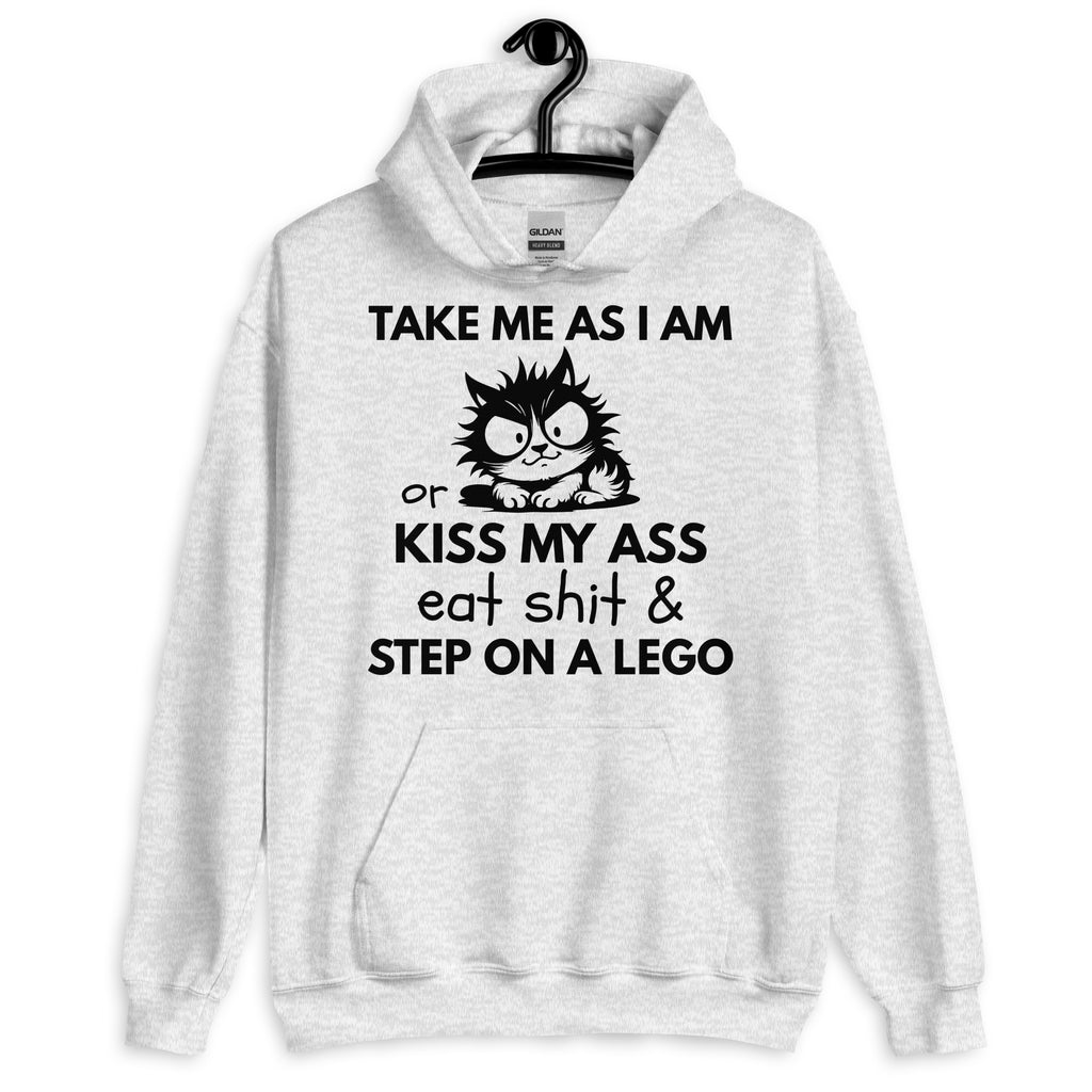 Savage, unfiltered, and unapologetically funny — this unisex hoodie says ‘Take Me As I Am Or Kiss My Ass, Eat Sht & Step On A Lego.’ Perfect for anyone who keeps it real with zero sugarcoating.